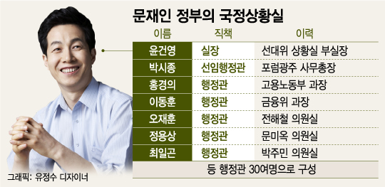국정상황실의 청와대 내 위치는 행정관의 숫자에서도 확인된다. 현재 국정상황실 내 행정관은 약 30명에 달한다. 다른 비서관실 행정관(5~6명)에 비해 압도적으로 많다. 윤 실장 바로 아래인 선임 행정관은 포럼광주 사무총장을 맡아 호남지역에서 문 대통령의 승리에 기여한 박시종 행정관이다. 국회의원 보좌관 출신으로는 오재훈(전해철)·정용상(문미옥)·최일곤(박주민) 행정관 등이 자리했다. 관 출신으로는 고용노동부 인적자원개발과장을 거친 홍경의 행정관, 금융위원회 구조개선과장을 거친 이동훈 행정관이 있다.