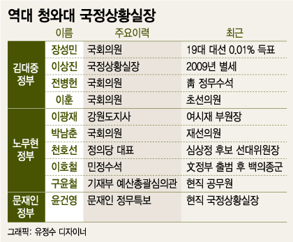 대통령의 측근들이 자연스럽게, 혹은 당연하게 국정상황실장을 맡아왔다. 초대 국정상황실장은 DJ의 최측근이자 국정상황실 구성을 건의한 장성민 전 의원이었다. 노무현 정부의 첫 국정상황실장은 이광재 전 강원도지사였다. 국정상황실장 경험을 바탕으로 정치적으로 성장한 인사들도 다수다. 3선의원 출신인 전병헌 청와대 정무수석, 현직 국회의원 박남춘·이훈 의원, 천호선 전 정의당 대표, 문 대통령의 최측근 이호철 전 민정수석 등의 전직이 국정상황실장이다.