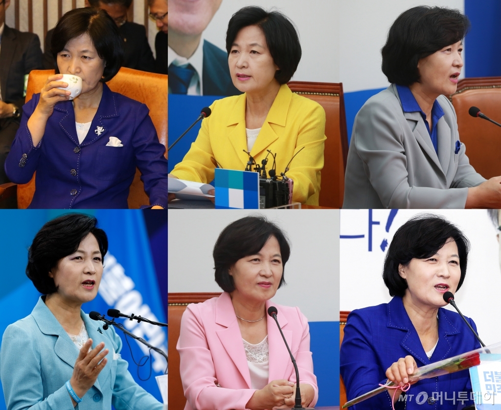 추 대표는 '추다르크'라는 별명답게 남성 정치인 사이에서 당 대표로 선출될 정도로 차갑고 강한 이미지이지만 옷만큼은 밝고 화사한 색을 즐겨 입는다. 특히 쨍한 옐로와 네이비 등 강렬한 색상의 재킷을 입을 때는 다른 패션 아이템을 모노 톤으로 맞춰 과하지 않으면서도 패셔너블한 느낌을 연출한다.