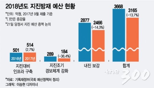 '지진하중'계산의 핵심이 될 지반조사 예산조차 편성 돼있지 않은 점도 문제다. 지반조사 예산 뿐아니라 지진관련 예산도 줄었다. 예정처 분석에 따르면 지난 9월 정부가 제출한 내년도 예산안 가운데 지진 방재 예산은 3165억 수준으로 올해 예산(3668억원) 대비 503억원 이상 줄었다. 특히 내진 보강 사업의 내년도 예산은 2466억원으로 올해 예산(2877억원)보다 411억원 감소했다. 정부가 이번 포항 지진 발생 전에 제출한 예산안이지만, 지난해 9월 경북 경주에서 역대 최대 규모의 지진이 발생한 것을 감안하면 안이한 예산 편성이라는 지적이 나온다.