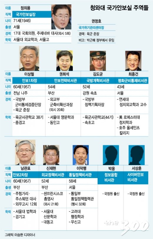 이같이 바쁜 국가안보실의 지휘자가 정의용 실장이다. 정 실장은 외무고시 5회로 주제네바 대사 등을 역임했다. 한-칠레 FTA(자유무역협정) 협상을 주도한 다자외교 및 통상 분야 전문가다. 최초의 비군인 출신 국가안보실장이기도 하다. 온화하고 꼼꼼한 스타일이지만 추진력이 강하다는 평가다. 문 대통령의 대선후보 시절 외교싱크탱크인 ‘국민아그레망’의 단장을 맡아 새 정부에서의 활약을 예고했었다.