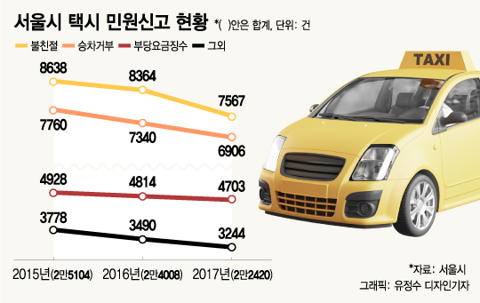3일 서울시에 따르면 지난해 서울시에 접수된 택시 민원 신고는 총 2만2420건이다. 세부적으로는 △불친절 7567건 △승차거부 6906건 △부당요금징수 4703건 순이었다. 2016년과 2015년에도 민원 신고가 각각 2만4008건, 2만5104건 발생했다.