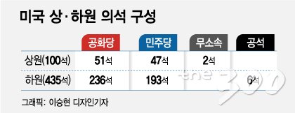 ◇정치 지형과 판세 전망 =2018년 현재 (115 회기) 미 연방 상·하원 모두 공화당이 다수당 위치를 차지하고 있다. 상원 의석 분포는 공화당 51석, 민주당 47석, 무소속 2석 등이다. 하원의 경우 공화당 235석, 민주당 193석, 공석 7석 등으로 공화당이 다수당이다.