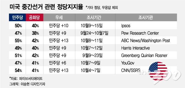 전문가들의 선거 전망은 '상원-공화당' '하원-민주당'이다. 하원 다수당 기준은 218석이다. 현재 민주당 의석에서 25석이 더 필요하다. 1950년 이래 하원 중간선거에서 대통령 소속 정당이 평균 26석을 잃었다는 통계에 민주당은 희망을 건다.