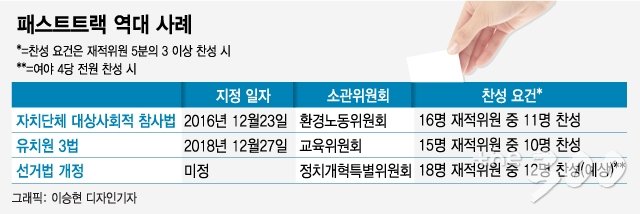 지금까지 패스트트랙 대상으로 지정된 안건은 박주민 민주당 의원이 발의한 '사회적 참사법'과 박용진 민주당 의원이 주도하고 바른미래당이 참여한 '유치원 3법'뿐이다. 이 두 법안은 민생 법안으로 한국당을 제외한 타 정당의 지지를 받아 끌어내 '5분의 3 찬성 요건'을 충족했다.