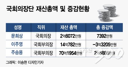 문희상 국회의장 재산 총액은 2억6072만원으로 전년 대비 7392만원 증가했다. 이주영 부의장 재산은 14억782만원으로 3억3205만원 줄었다. 주승용 부의장 재산 총액은 70억1954만원에 달한다.