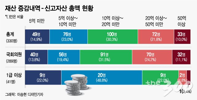 10억원 이상 20억원 미만 재산을 보유한 의원이 91명(31.5%). 20억원~50억원의 재산을 보유했다고 신고한 의원은 70명(24.2%)이다. 5억원 미만은 40명으로 집계됐다.