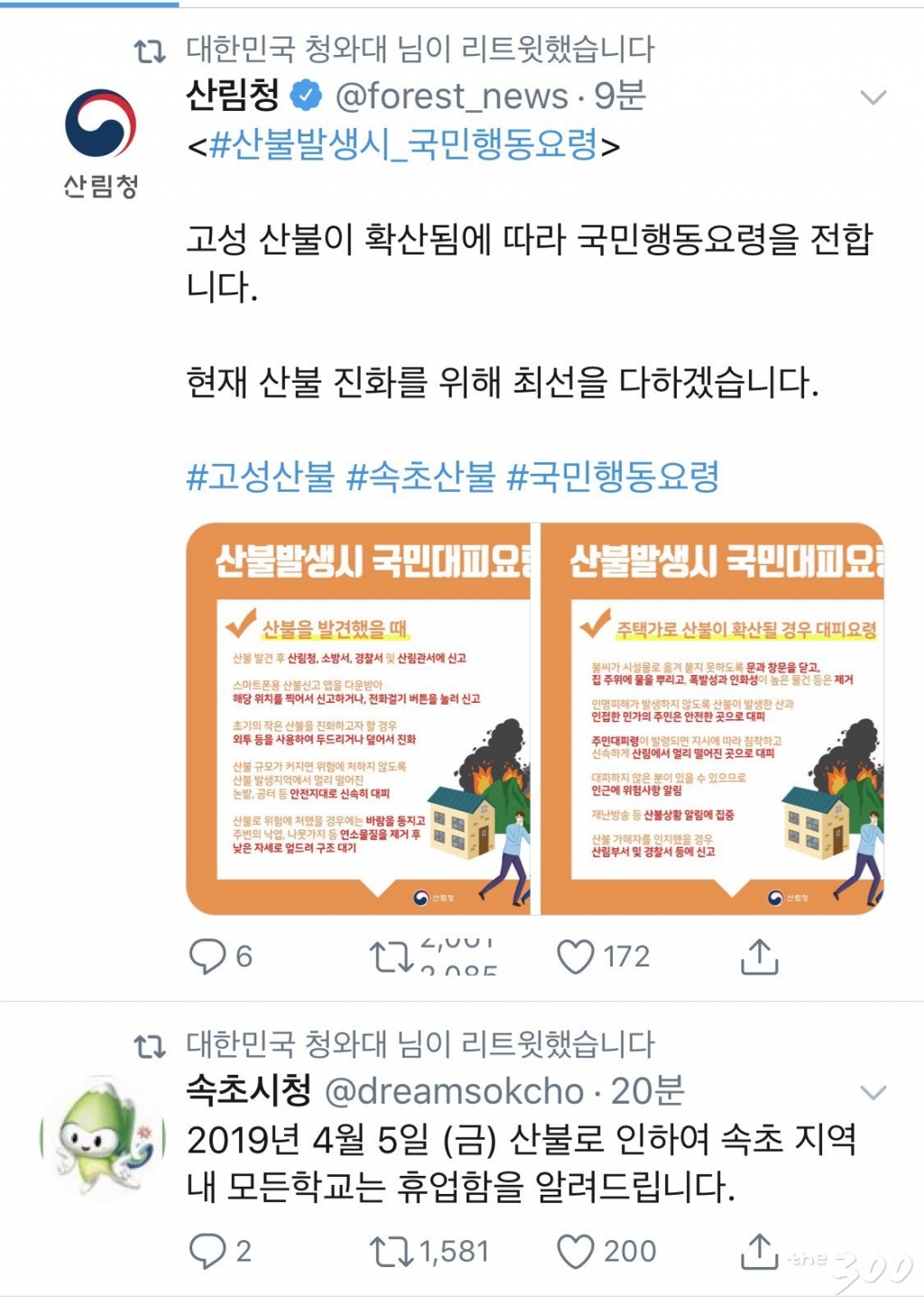 청와대와 정부가 강원 고성 속초 인제 지역 산불 총력대응에 나선 가운데 청와대 경찰청, 산림청 등이 사회관계망서비스(SNS)를 통해 행동요령과 각종 속보를 전파하고 있다.