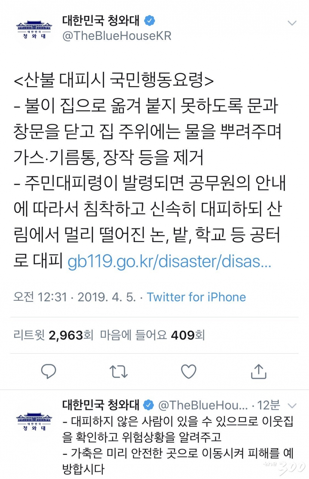 청와대는 주민대피령 발령시 공무원 안내에 따라 침착하고 신속히 대피하되, 산림에서 멀리 떨어진 논 밭 학교 등 공터로 대피할 것 등, '산불 대피시 국민행동요령'을 트위터에 게시했다.