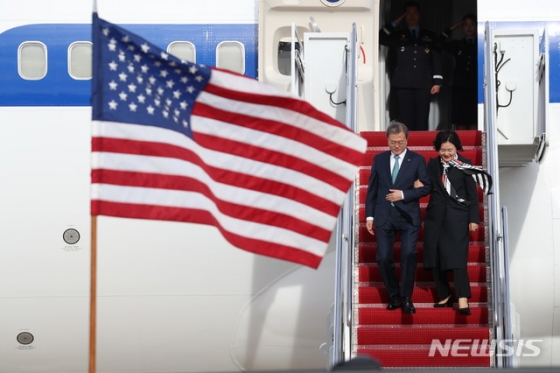 문 대통령은 지난 10일 경기 성남 서울공항을 떠나 11일 오전, 현지시간 10일 오후 5시30분경 메릴랜드주 앤드류스 기지에 도착했다. 조윤제 주미대사, 마크 내퍼 미 국무부 동아태부차관보대행 등이 영접을 나와 공군1호기에서 내리는 문 대통령과 김정숙 여사를 맞이했다.