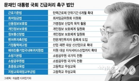 △탄력근로제(근로기준법)와 최저임금 결정체계 개편(최저임금법) △빅데이터 산업 육성(개인정보보호법 등 3건) △벤처투자 활성화(벤처투자촉진법) △기업 활력 제고(기업활력제고법) △소방공무원의 국가직 전환(소방기본법 등 2건), 고등학교 무상교육(초중등교육법 등2건) 등이다. 문재인 대통령이 “당장 급하다”며 국회 통과를 호소한 법안이기도 하다.