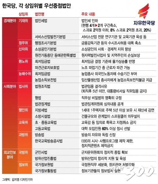 ‘한국당도 국회정상화를 위한 물밑협상이 이어지면서 6월 임시국회 개원 후 중점적으로 처리해야할 법안을 추렸다. 법인세법 등 20여개 법안이다. 한국당 역시 초점을 ’경제활력‘에 맞췄지만 방법론은 여당과 다르다.