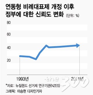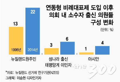 실제로 선거제 개정 후 1996년 처음 치러진 선거에서 뉴질랜드 원주민인 마오리족은 전체 의회 구성 중 13%를 차지했지만, 2014년엔 22%까지 늘었다. 섬 나라 출신 이민자들을 뜻하는 태평양계는 3%(1996년)에서 2014년 6%로 아시안 역시 같은 기간 1%에서 4%로 급격히 늘었다.