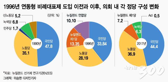 연동형 비례대표제의 도입으로 거대 양당제는 무너졌다. 각 정당은 법안 처리에 필요한 과반 수 이상의 지지를 위해 연립정부를 구성할 수 밖에 없다. 내각 구성이 여당 일변도인 한국과 달리 뉴질랜드 부총리겸 외교부장관, 지역경제발전부·국방부·내무부·환경부 장관 등 요직도 소수당인 제1당과 녹색당이 함께 나눠 맡고 있다.