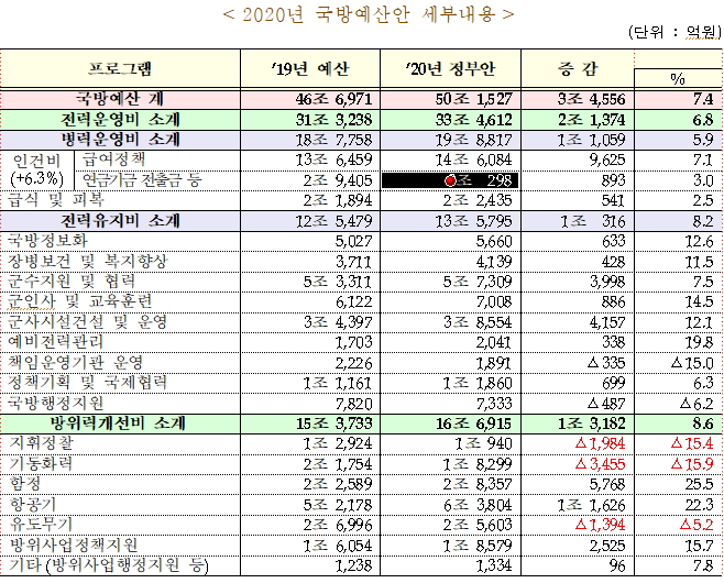 국방부는 2020년 국방예산을 전년에 비해 7.4% 증가한 50조 1527억원으로 편성해 9월 3일 국회에 제출할 예정이라고 29일 밝혔다. 군사력 건설에 투입되는 방위력개선비가 대폭 증액됐는데 전년 대비 8.6% 증가한 16조 6915억원 규모로 짜였다. 현 정부 출범 후 방위력개선비의 평균 증가율 11.0%에 달한다. 지난 정부 9년간(2009∼2017년) 평균증가율(5.3%)의 약 2배 수준이다.