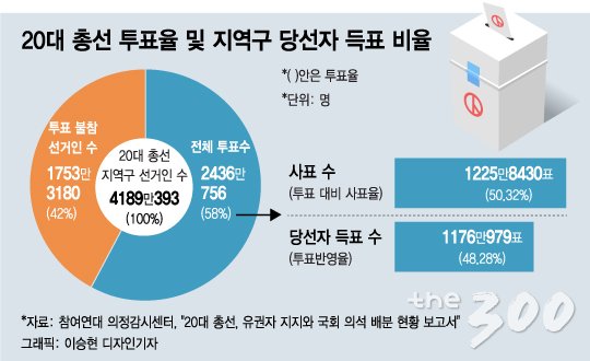 머니투데이 더300(the300)에서 중앙선관위원회 선거통계시스템의 데이터를 분석한 결과, 20대 총선에서 지역구 당선자의 득표율은 평균 48.9%로 전체 투표의 절반에 미치지 못했다.