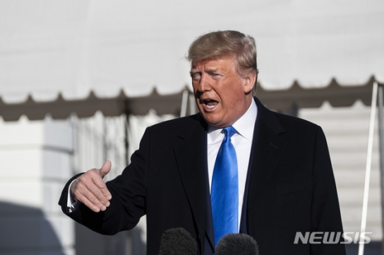 ![[워싱턴=AP/뉴시스]도널드 트럼프 미 대통령이 7일 백악관에서 플로리다주로 향하기 위해 전용 헬기 마린 원에 탑승하기 전 기자들과 이야기하고 있다. 트럼프는 이날 "비핵화 문제가 협상 테이블 위에서 치워졌다"는 김성 유엔주재 북한 대사의 발언에 대해 "북한과 좋은 관계를 유지하고 있다"고 강조하면서 발언의 중요성을 폄하했다. 2019.12.8](https://thumb.mt.co.kr/cdn-cgi/image/f=avif/21/2019/12/2019121014297625432_1.jpg)