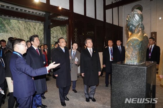 ![[청두(중국)=뉴시스]배훈식 기자 = 문재인 대통령과 리커창 중국 총리, 아베 일본 총리가 24일(현지시간) 중국 쓰촨성 청두 두보초당을 관람하고 있다. 2019.12.24. dahora83@newsis.com](https://thumb.mt.co.kr/cdn-cgi/image/f=avif/21/2019/12/2019122418407610264_1.jpg)