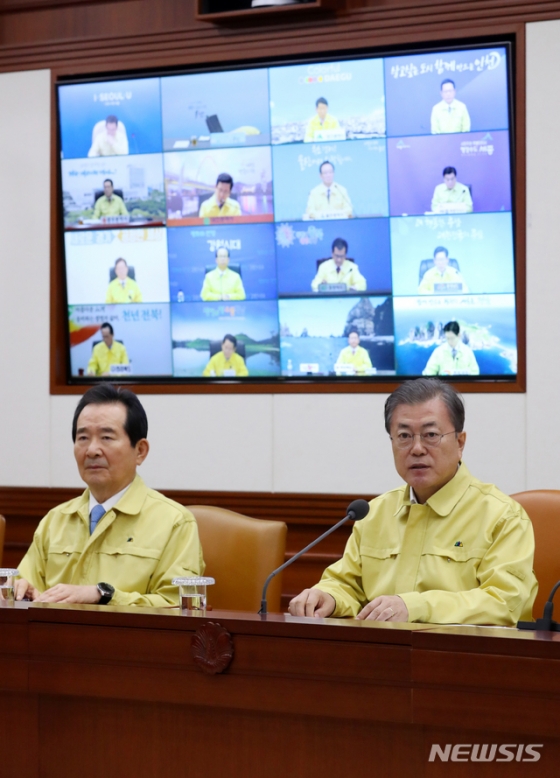 ![[서울=뉴시스]배훈식 기자 = 문재인 대통령이 30일 서울 종로구 정부서울청사에서 열린 신종 코로나바이러스 감염증 대응 종합 점검회의에 참석해 발언하고 있다. 왼쪽은 정세균 국무총리. 2020.01.30. dahora83@newsis.com](https://thumb.mt.co.kr/cdn-cgi/image/f=avif/21/2020/01/2020013016577624519_1.jpg)