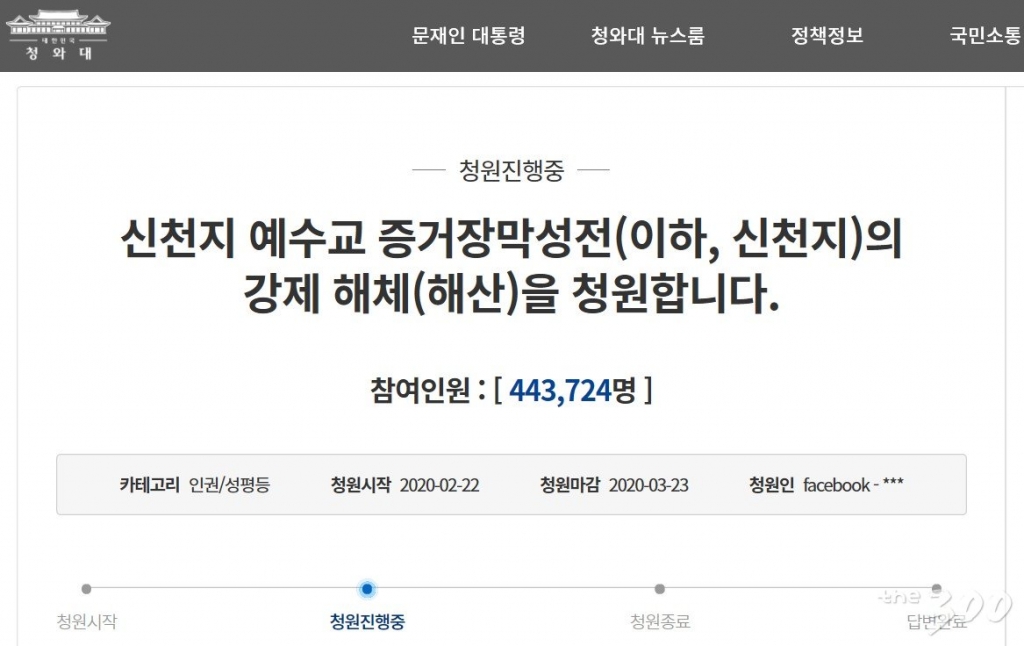 신천지예수교회를 강제로 해체해야 한다는 내용의 청와대 국민청원이 청원시작 이틀만에 40만명 이상의 동의를 얻었다. 24일 오전 9시18분 기준 44만3724명이 해당 청원에 동의했다.