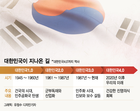 머니투데이는 타락한 진영 의식을 깨고 건강한 진영 의식으로 거듭나는, ‘대한민국 4.0’ 시대를 제언한다. 대한민국은 이승만 정권 시대와 박정희·전두환 정권, 1987년 체제 등 크게 3번의 변곡점을 거쳤다.