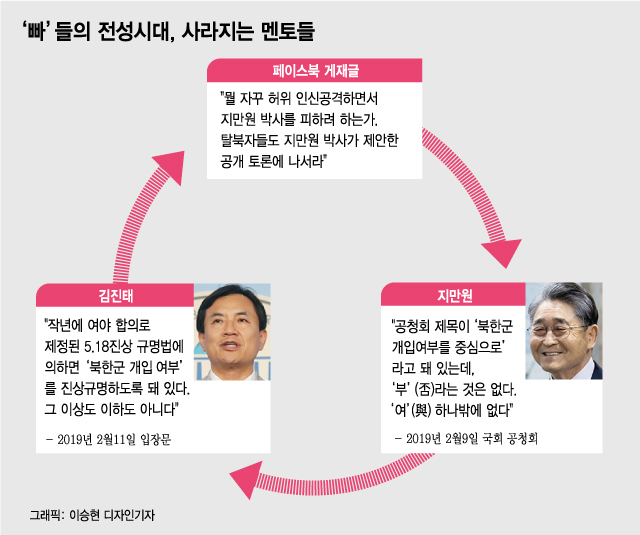 보수 진영 ‘빠’들은 전통을 자랑한다. ‘5·18 민주화 운동’은 그들의 단골 메뉴다. 보수 논객 지만원씨는 지난해 2월 김진태·이종명 당시 자유한국당 의원이 공동 개최한 ‘5·18 진상규명 대국민공청회’에서 5·18 민주화 운동에 북한군이 개입했다는 취지의 주장을 펼쳤다.