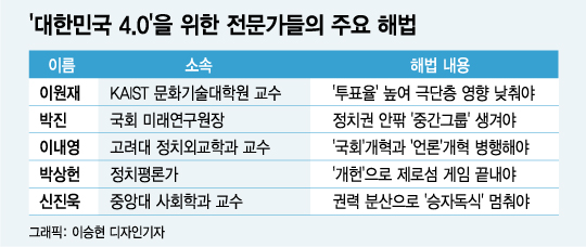 박상헌 정치평론가도 “현행 대통령제는 한 진영이 권력을 장악하는 제로섬 게임”이라며 ‘내각책임제’나 ‘대통령 4년 연임제’로의 개헌이 필요하다고 말했다. 막강한 권력을 국회와 나누거나, 연임을 노리는 대통령이 첫 임기를 긴장 속에서 살게 해야 견제와 균형이 이뤄진다는 뜻이다.