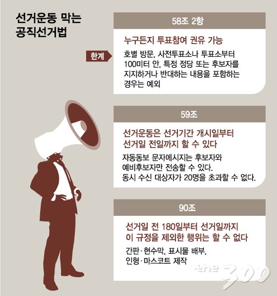 여기에 공직선거법 59조와 254조가 더해진다. 58조와 선거운동 기간 등을 규정한 59조, 처벌 조항인 254조 등을 종합하면 투표 마감 전까지 이 법에 규정된 방법을 제외하고 선거운동을 하면 3년 이하 징역이나 600만원 이하 벌금에 처한다.