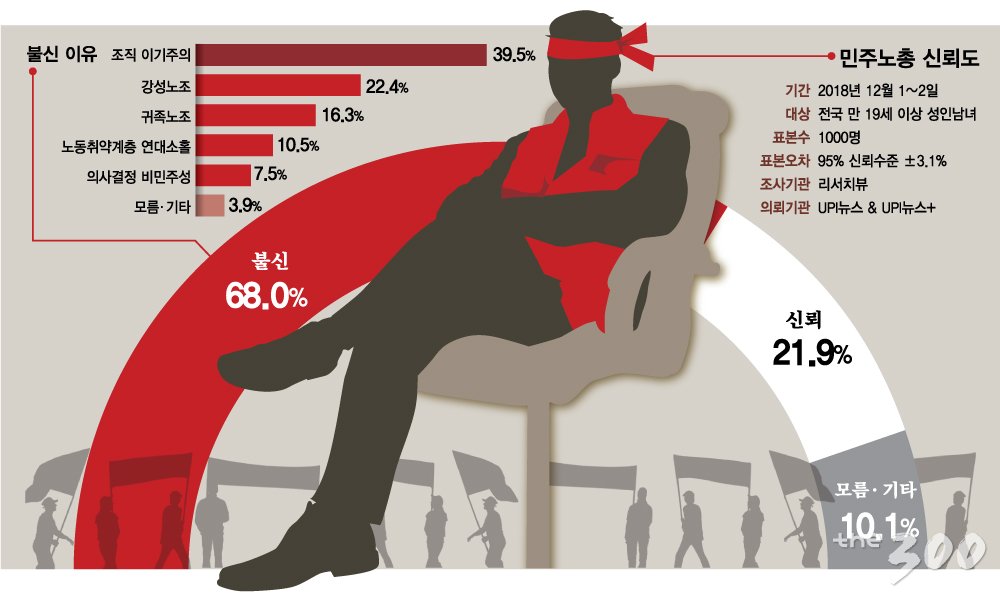 국민들이 노동계와 ‘거리두기’ 하는 것도 같은 이유다. 여론조사 업체 리서치뷰가 2018년말 발표한 조사를 보면 응답자 68%가 민주노총에 대해 ‘불신’한다고 답했다. ‘신뢰’한다는 응답자는 21.9%에 그쳤다. ‘모름·기타’는 10.1%였다.