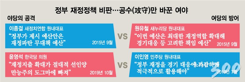 여당은 ‘확장적 재정정책’을 외친다. 야당은 ‘재정 건전성’으로 맞선다. 여야가 뒤바뀌면 주장도 정반대가 된다. 어제의 ‘좋은’정책이 오늘은 ‘나쁜’정책이다. 야당을 향해 맹목적인 발목 잡기를 비판하던 여당은 정권을 빼앗긴 후엔 야당이 했던 발목 잡기를 그대로 한다.
