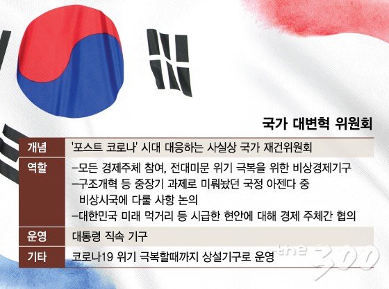 이를 위한 가칭 ‘국가 대변혁 위원회’를 만들 것을 제언한다. 정부, 국회, 언론, 학계, 경영계, 노동계 등이 모두 참여하는 국가기구다. 국난 극복과 ‘포스트 코로나’ 시대 새로운 대한민국을 그리는 단위다. 대한민국 체질 개선을 위해 바꿀 것들을 모으고 논의하는 기구다. 우리 경제주체 모두의 자율과 창의가 가능토록 하는 게 ‘국가 대변혁 위원회’가 할 일이다. 대한민국의 사활이 걸린 문제다.