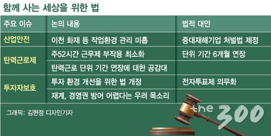 탄력적 근로시간제 개선 등을 담은 근로기준법에 대한 논의도 시급하다. 현행 3개월인 탄력 근로제 단위 기간을 6개월로 연장하는 내용의 근로기준법 개정안은 지난해 발의됐지만, 국회 환경노동위원회에 계류돼 있다.