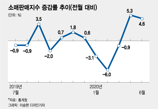 최근 발표된 5월 산업활동동향에서도 생산과 투자 모두 부진한 가운데서도 소매판매지수만큼은 4.6%로 지난달에 이어서 높은 증가세를 이어갔다. 이는 코로나19 경제위기 속에서도 소비 경기가 꺾이지 않고 두 달째 호조를 보이고 있다는 것으로 해석할 수 있는 부분이다.