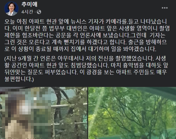 추 장관은 "한 달 전쯤 법무부 대변인은 아파트 앞은 사생활 영역이니 촬영 제한을 협조 바란다는 공문을 각 언론사에 보냈는데 기자는 계속 '뻗치기'를 하겠다고 한다"며 "출근을 방해하므로 이 상황이 종료될 때까지 집에서 대기하며 일을 봐야 하겠다"고 했다.