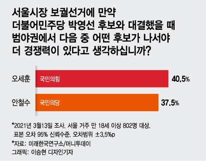 이날 여론조사에서도 오 후보는 야권 후보로서의 '적합도'와 '경쟁력' 모두 안 후보에 앞서는 것으로 나타났다. 범야권 단일후보 적합도는 오 후보 36.5%, 안 후보 33.2%로 집계됐고 후보 본선 경쟁력 항목에서도 오 후보(40.5%)가 안 후보(37.5%)를 3%포인트 앞섰다.