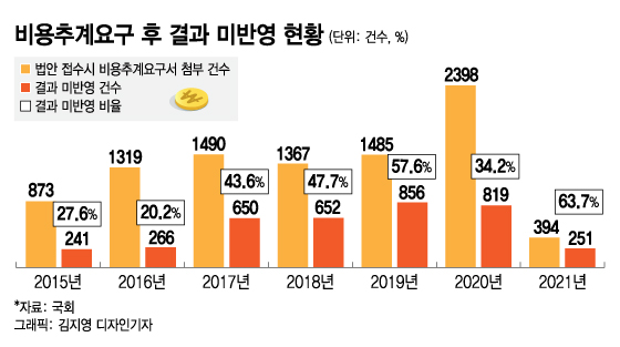 비용추계를 요구하는 방식으로 법안 발의 요건을 충족한 후 그 결과를 반영하지 않은 비율도 63.7%에 달했다. 6년 전 수치의 2.3배에 달한다. 여야의 입법 경쟁이 과열되는 가운데 국가재정의 안정적 관리를 도모한다는 비용추계 제도 취지가 무색하다는 목소리가 높아진다.