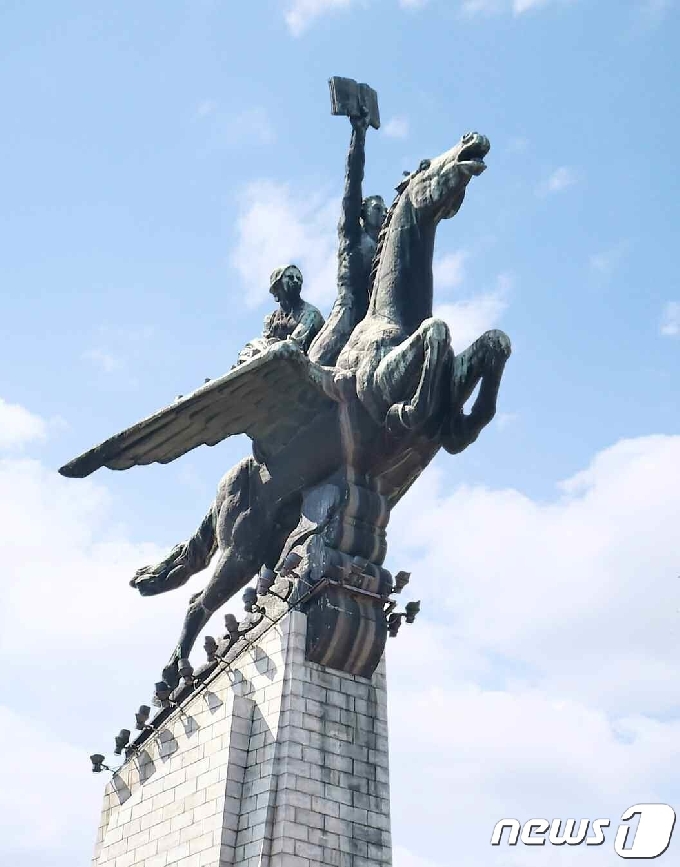 (평양 노동신문=뉴스1) = 북한 노동당 기관지 노동신문은 14일 태양절(김일성 주석 생일·15일)을 하루 앞두고 "우리 나라에는 세상에 오직 하나밖에 없는 천리마 동상이 있다"면서 동상 사진을 실었다. 이 동상은 "어제도 오늘도 변함없는 주체 조선의 영웅적 기상이고 위대한 민족, 조선의 영원한 승리와 영광의 상징"이라고 신문은 짚었다.