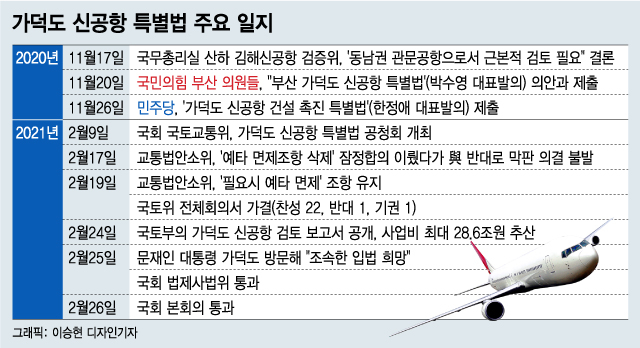 야당 관계자는 "법제처가 결국 김해신공항을 폐기하고 가덕도 신공항을 만들려는 부산시 손을 들어준 것"이라며 "무리한 법적 해석을 동원해 가덕도 신공항의 법적인 근거와 당위성을 갖춰준 꼴"이라고 지적했다. 입지 선정 절차를 건너뛴 가덕도 신공항은 지난달 28일 사전타당성 조사에 돌입했다.