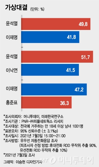 윤 전 총장은 이 지사와의 가상 양자대결에서 49.8%의 지지를 얻어 41.8%의 이 지사를 8.0%p 앞섰다. 윤 전 총장과 이 전 대표의 양자대결에서는 윤 전 총장이 51.7%, 이 전 대표가 41.5%의 지지를 얻었다.