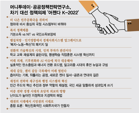 머니투데이는 이에 내년 대선을 앞두고 여야 대선 후보를 가리지 않고 대한민국 대통령이 되려면 반드시 고민해봐야할 정치·경제·사회 등 다양한 분야의 '어젠다'를 제시해 보려 한다. 공공정책전략연구소(KIPPS, 킵스)와 함께 앞으로 9회에 걸쳐 '대한민국 공론장'을 마련한다.