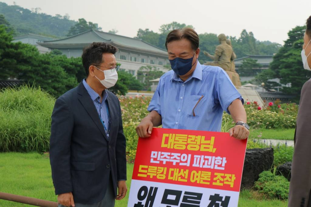 ![[서울=뉴시스] 전신 기자 = 이철희 청와대 정무수석이 29일 서울 종로구 청와대 앞 분수대 광장에서 드루킹 댓글 조작 사건 관련 문재인 대통령의 사과를 촉구하며 1인 시위를 벌이고 있는 정진석 국민의힘 의원을 찾아 대화하고 있다. (사진 = 정진석 의원실 제공) 2021.07.29. photo@newsis.com *재판매 및 DB 금지](https://thumb.mt.co.kr/cdn-cgi/image/f=avif/21/2021/07/2021072923050669289_1.jpg)
