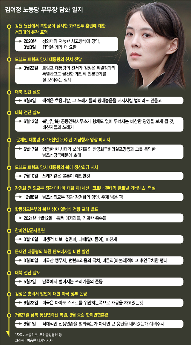 2일 머니투데이 더300(the300)이 지난해 3월3일부터 이달 1일(전날)까지 김 부부장이 본인 명의로 발표한 담화문 13건(대남 메시지 10건?대미 메시지 3건)을 모두 조사한 결과, 대남 메시지를 기준으로 욕설?비하같은 원색적인 비난 표현이 없는 담화는 1일자 담화가 처음인 것으로 드러났다. 김 부부장은 전날자 담화문에서 통신선 복원을 두고 "남조선안팎에서는 나름대로 그 의미를 확대하여 해석하고 있으며 심지어 북남수뇌회담문제까지 여론화하고 있던데 나는 때이른 경솔한 판단이라고 생각한다"고 했지만 과거와 달리 욕설?비하 표현은 들어가지 않았다. 대신 8월 중순 예정된 한미훈련을 두고 "우리 정부와 군대는 남조선측이 8월에 또다시 적대적인 전쟁연습을 벌려놓는가 아니면 큰 용단을 내리겠는가에 대하여 예의주시해볼것", "희망이냐 절망이냐? 선택은 우리가 하지 않는다"등 표현을 썼다.