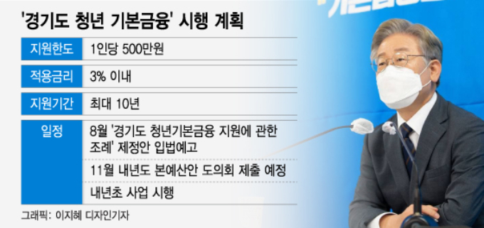 더불어민주당 유력 대권주자인 이재명 경기도지사가 경기도 청년들을 대상으로 1조원 규모의 '청년 기본금융'을 추진한다. 3% 안팎의 저금리로 최대 500만원을 '무심사'로 10년 장기 대출해주는 정책이다.