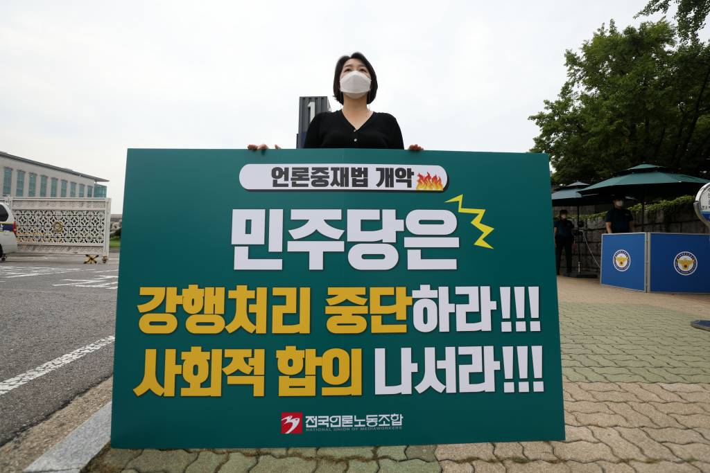 ![[서울=뉴시스] 김선웅 기자 = 언론노조 관계자가 30일 서울 여의도 국회 앞에서 민주당의 언론중재법 강행처리 중단과 사회적 합의를 촉구하는 1인 피켓시위를 하고 있다. 2021.08.30. mangusta@newsis.com](https://thumb.mt.co.kr/cdn-cgi/image/f=avif/21/2021/08/2021083014372417749_1.jpg)