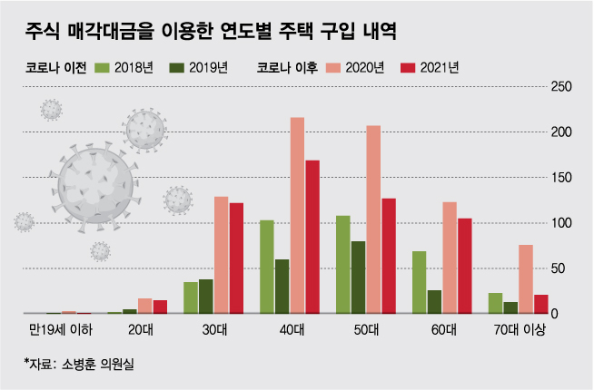 2018년부터 올해 5월까지 주식 매각대금을 이용한 주택 구입 내역을 분석해 보면, 연령별로는 40대가 548명으로 가장 많았고, 50대 522명, 30대 324명, 60대 323명, 70대 이상 133명 등이다. 40대 이상이 주식 매각대금으로 집을 산 이들의 80.6%를 차지했다. 반면 20대는 39명, 만 19세 이하 미성년자는 5명으로 소수에 불과했지만, 그 수는 2020년 이전보다 각각 4.6배, 4.0배 증가하는 등 급증한 것으로 확인됐다.