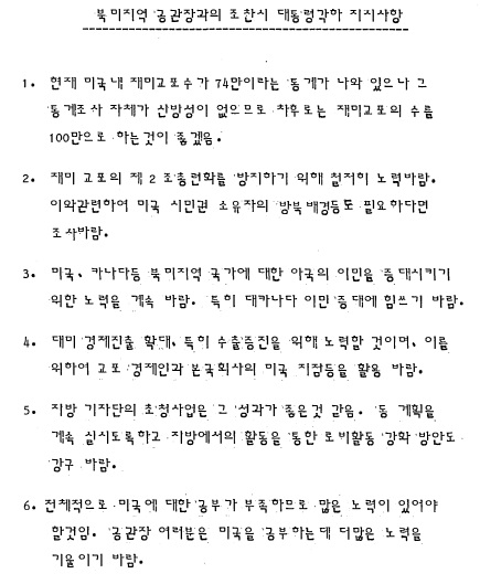 16일 머니투데이 더 300(the300)이 외교부의 2급 비밀 해제 문건인 1985년5월3일자 '각하 지시사항 이행방안 수립'과 외교부 통계를 비교한 결과 이같은 '통계 조작' 정황이 포착됐다. 외교부 문건상 전 전 대통령은 북미지역 공관장과의 조찬시 "현재 미국 내 재미교포 수가 74만이라는 통계가 나와 있으나 그 통계조사 자체가 신빙성이 없다"며 '100만명'이 좋다고 했다.
