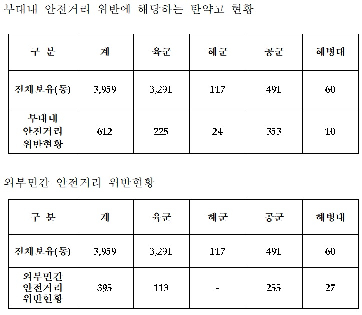 우리 군의 전체 탄약고 가운데 약 4분의1은 다른 시설과 안전거리를 준수하지 않은 채로 들어서 있는 것으로 나타났다. 우리 군의 탄약고 노후화와 맞물려 대형 피해를 야기할 수 있다는 우려가 나온다.
