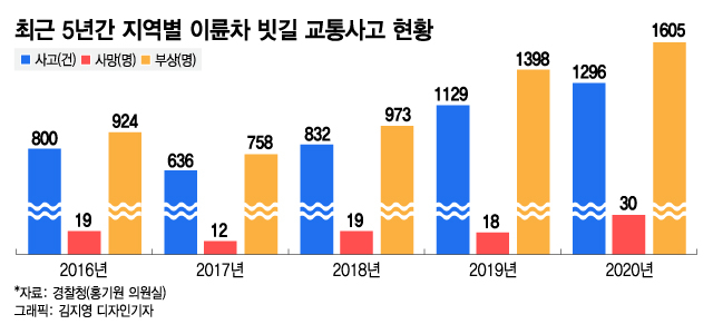 특히 빗길 교통사고는 2018년 832건 대비 2020년 1296건으로 약 56% 급증한 것으로 나타났다. 같은 기간 사망자도 19명에서 30명으로 약 58% 증가했다. 이륜차 구조상 빗길에 취약하고 신체가 노출돼 있어 시야 및 주의력 확보가 어려운데, 코로나 장기화로 배달 주문이 늘어난 데 따른 것으로 풀이된다.