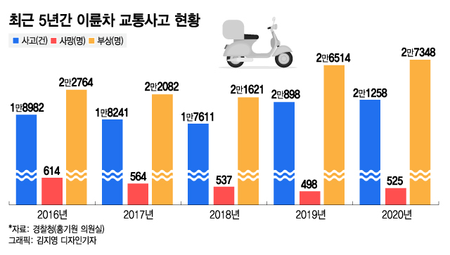 1일 국회 국토교통위원회 소속 홍기원 더불어민주당 의원이 경찰청으로부터 제출받은 자료에 따르면, 이륜차 교통사고는 2018년 1만7611건 대비 2020년 2만1258건으로 3년새 약 21% 증가했다. 자동차 사고가 감소 추세로 접어든 것과는 대비된다.