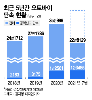 눈에 띄는 것은 공익신고의 가파른 증가세다. 공익신고를 통한 단속 건수는 2018년 2163건에서 2020년 1만2561건으로 5.8배나 급증했다. 올해는 7월 기준 1만3485건을 기록해 이미 작년 한 해 공익신고 단속 건수를 넘어섰다. 국토교통부와 한국교통안전공단은 지난해 5월부터 3000명 규모의 '이륜차 교통안전 공익제보단'을 운영하고 있다.